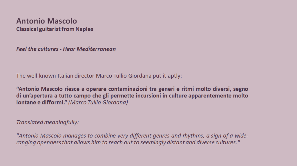 Listening to Antonio Mascolo's music reveals a dialogue that bridges diverse musical genres, embodying the essence of Naples. His work symbolizes the interconnectedness of cultures throughout the Mediterranean region.