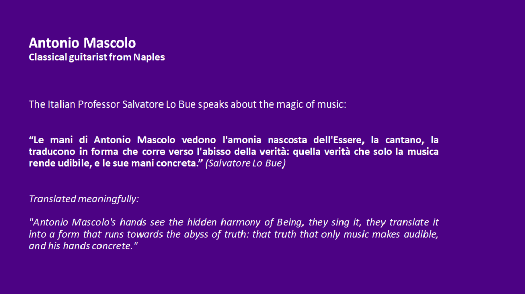 When you explore a life performance of Antonio Mascolo, it will reflect the diversity of cultures combined with the attachment to Naples with the idea of openness and dialogue.